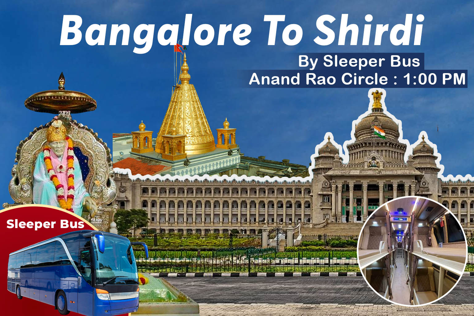 Sleeper buses from Bangalore to Shirdi package usually depart in the afternoon, allowing you to travel overnight and reach Shirdi morning. These are the usual departure & arrival timings.